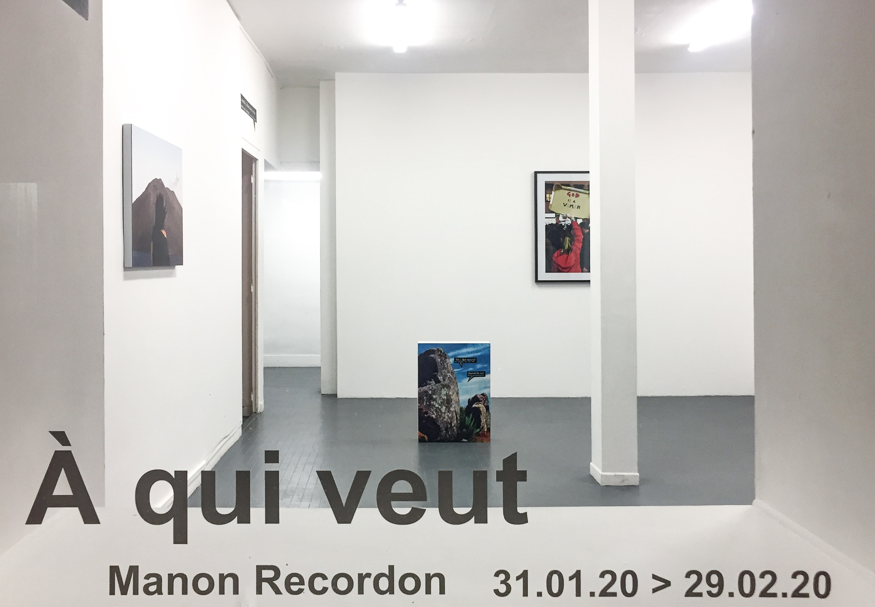Manon Recordon associe à sa pratique photographique l’exploration d’archives, personnelles ou extérieures, et le photomontage. Elle refuse la littéralité et intervient sur les techniques d’impression, le format, l’encadrement, l’agencement et le montage pour activer les rencontres entre des images d’origines disparates, éloignées, singulières. Sa méthode de combinaisons iconographiques, qui s’appuie sur le maniement et le détournement des images, est aux antipodes de tout protocole. Ses photographies évoluent parmi des images provenant de magazines, d’internet, d’illustrations, anciennes ou récentes, de romans photo, dans un mouvement d’ouverture et d’émancipation. À partir de ce matériau dissonant elle élabore des projets qui font écho à des événements marquants, historiques ou vécus. L’agencement des photographies renvoie ainsi aux engagements de l’artiste. Manon Recordon ne veut pas laisser les interprétations issues de classifications traditionnelles prendre le pas sur la pluralité des significations que recèlent ses compositions. Les rencontres, les confrontations et leur organisation dans l’espace d’exposition délimitent une sphère de sensibilité. Un message latent se dessine, qui n’est jamais ostensible. L’artiste abolit la hiérarchie entre la nature des traumatismes, qu’ils soient collectifs ou individuels, voire personnels. Elle traite de la question de la vulnérabilité de l’homme face à l’Histoire et les lois de la nature à partir de ses expériences. Au cœur de À qui veut prend place l’impressionnante éruption du Stromboli en juillet 2019, qui fait prendre conscience à Manon Recordon de notre fragilité manifeste. L'exposition, en devenant le lieu d'une lutte entre les oeuvres, témoigne de l’incertitude qui hante l’homme, incertain face à la nature, mais toujours combatif et déterminé à se livrer aux tourments d’un futur chimérique.